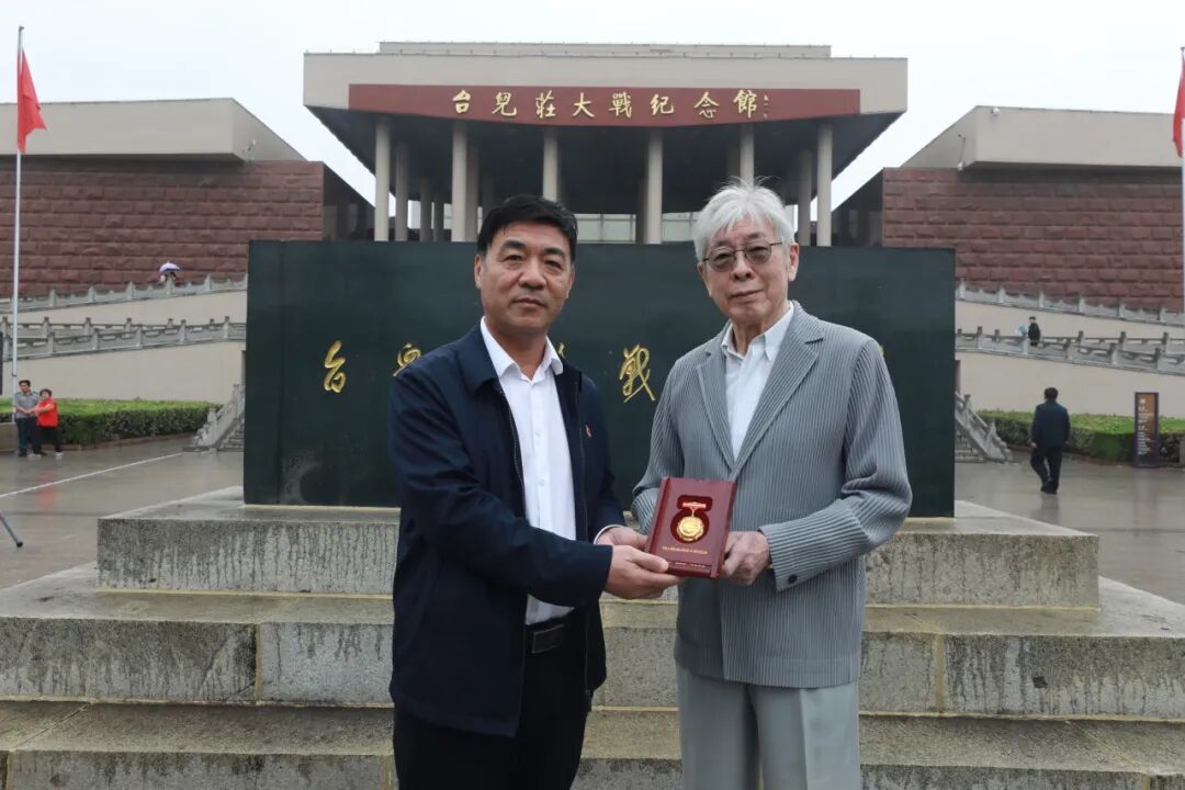 缅怀先烈 · 致敬英雄 仪式上,孙大强先生将这枚承载国家褒奖与历史记忆的纪念章捐赠给台儿庄大战纪念馆,馆长孔令欣代表纪念馆接受捐赠。现场嘉宾共同见证这一传承抗战精神的重要时刻。